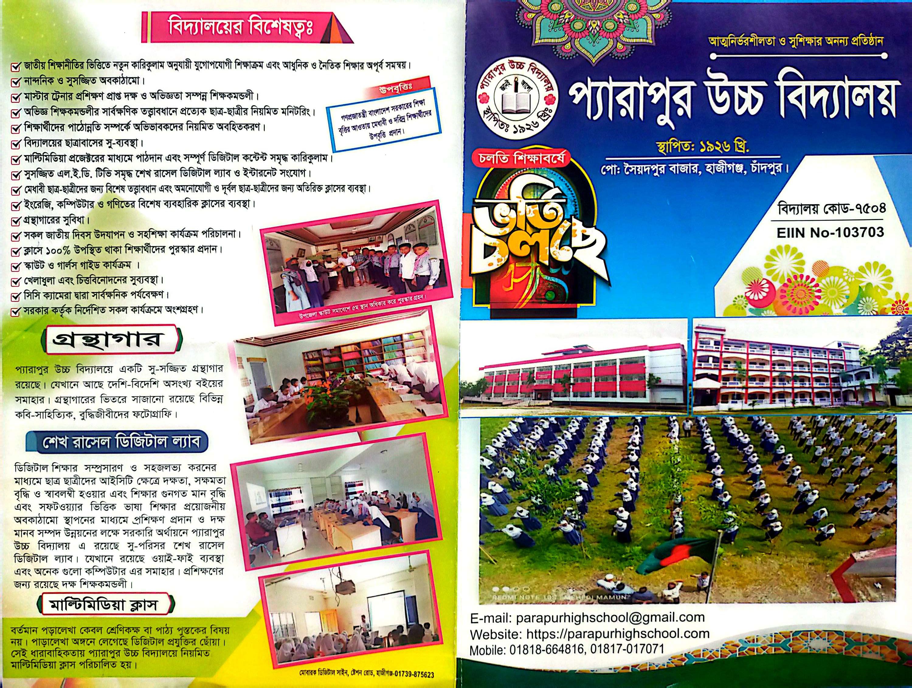 প্যারাপুর উচ্চ বিদ্যালয়টি প্যারাপুর এর মূলকেন্দ্রে অবস্থিত। এটি বাংলাদেশের অন্যতম শিক্ষা প্রতিষ্ঠান। নিবেদিতপ্রাণ কতিপয় শিক্ষানুরাগীর সমন্বয়ে গঠিত ‘ ম্যানেজিং কমিটির’- এর প্রত্যক্ষ নিয়ন্ত্রণে সুষ্ঠভাবে পরিচালিত এক আদর্শ বিদ্যাপীঠ। প্রতিষ্ঠানটি ইতোমধ্যে জাতীয়ভাবে শ্রেষ্ঠত্বের স্বীকৃতি লাভ করেছে। বিগত কয়েক বছর যাবৎ মাধ্যমিক পরীক্ষায় এ প্রতিষ্ঠানের পরীক্ষার্থীরা ভাল ফলাফল অর্জন করে কৃতিত্বের পরিচয় দিয়েচে। এ শিক্ষা প্রতিষ্ঠানে একটি শিক্ষার্থী ভর্তি হয়ে নিম্নমাধ্যমিক, মাধ্যমিক ও পাঠ শেষ করে বিভিন্ন বিশ্ববিদ্যারয়, মেডিকেল কলেজ, প্রকৌশল বিশ্ববিদ্যালয় প্রভৃতি প্রতিষ্ঠানে ভর্তি হওয়ার সুযোগ লাভ করে কর্মজীবনে উজ্জ্বল দৃষ্টান্ত স্থাপন করতে পারে। প্রত্যেক শিক্ষার্থীর মধ্যে সুনাগরিকসুলভ ব্যক্তিত্ব, উদারতা, শৃঙ্খলা, সত্যনিষ্ঠা, দেশপ্রেম ও আধুনিক মন-মানসিকতা বিকশিত করে তোলাই প্রতিষ্ঠানের মূল লক্ষ্য। এ লক্ষ্য অর্জনে অভিভাবক-অভিভাবিকাগণের ভূমিকা অত্যন্ত গুরুত্বপূর্ণ। ম্যানেজিং কমিটির সদস্যবৃন্দ, শিক্ষক, শিক্ষার্থী ও অভিভাবকদের সম্মিলিত প্রচেষ্টায় এ প্রতিষ্ঠানের প্রতিটি শিক্ষার্থীকে সাফল্যের শীর্ষে পৌঁছানো সম্ভব। শিক্ষার্থীদের সার্বিক সাফেল্য কামনা করছি।...