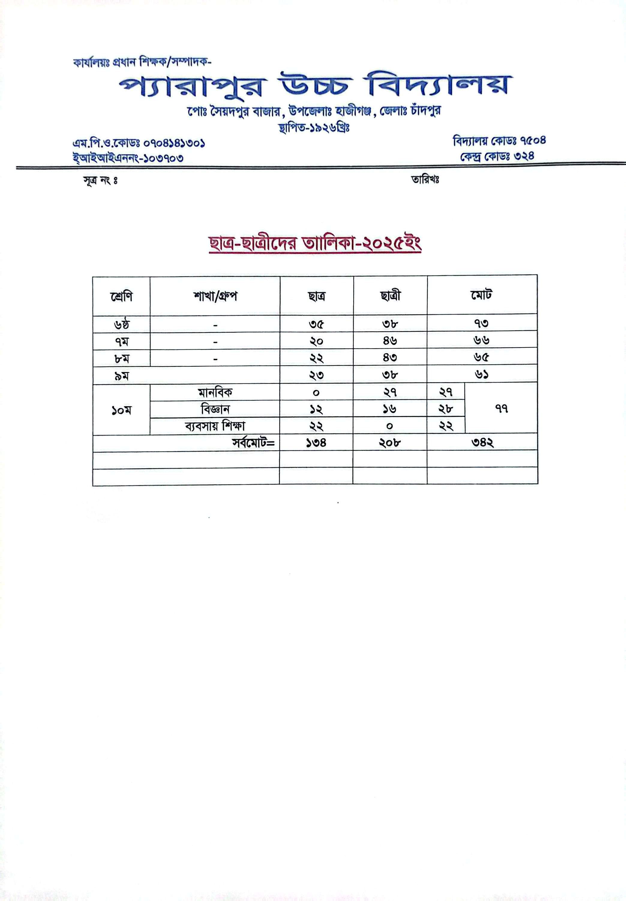 ২০২৫ সালের লিঙ্গ ভিত্তিক শ্রেণি শিক্ষার্থীর তথ্য