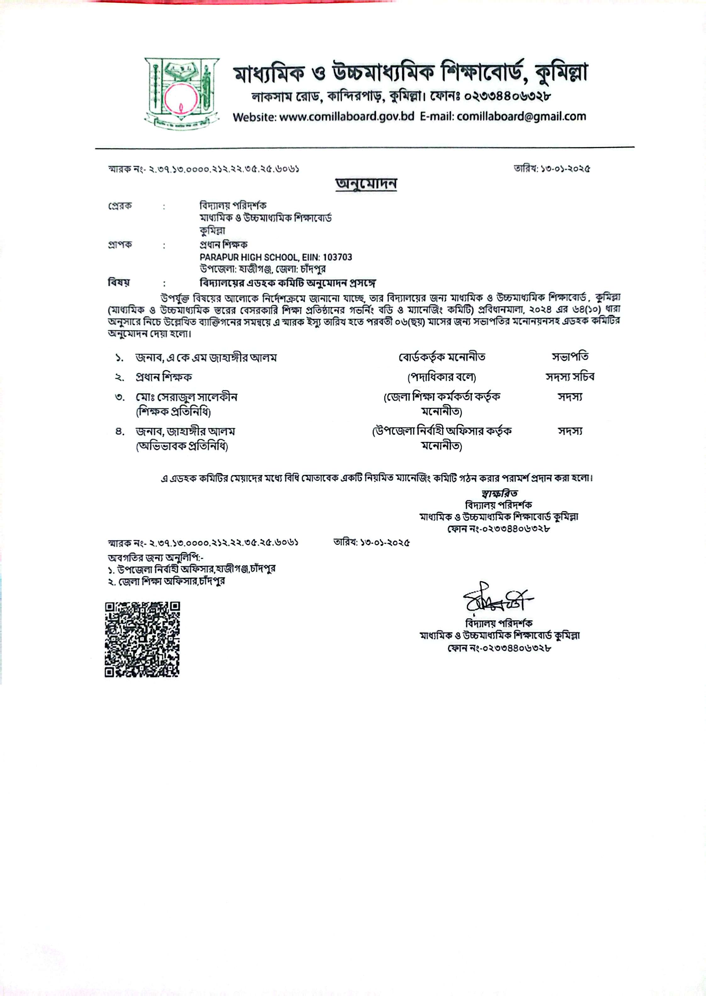 বিদ্যালয়ে বর্তমান ব্যবস্থাপনা কমিটির তথ্য