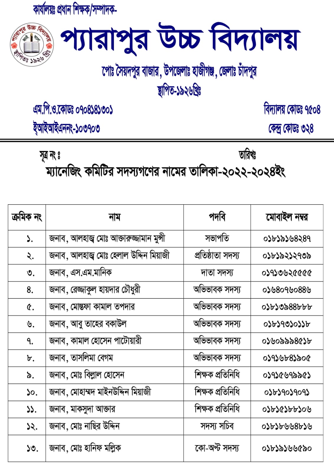 ম্যানেজিং কমিটির তথ্য ২০২২-২৪